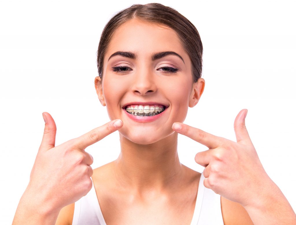 Portrait of a beautiful woman with braces on teeth, isolated on a white background